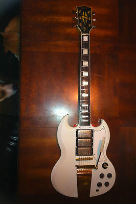 '80s Burny SG Custom. Refinished in Alpine White Nitrocellulose. Original Tailpiece switched out for a Vibrola - style. Original tailpiece will be included. Gold Hardware is original to guitar. Headstock logo switched out for the Brand it's copying(email for pic). Neck profile is more like a '60s style than other manufacturers reissues. Neck feels great, guitar plays great. Humbuckers sound good, makes you feel like it's a real '60s guitar. Finish is closet classic-light relic. Ships for $45 insured to the lower 48 UPS. Will pack well but no c ase included.Update: I've received numerous questions about the condition & history of the refinish. This is not a pristine, factory quality,finish. This is more of a light relic with little nicks & a few blotches. I don't know when the refinish was completed. Overall, this a nice vintage looking players guitar. Sounds great, plays great, lots of VIBE! Because I don't know a lot about some of the specifics of the Burny, I've started the price low. I'm selling this for a good friend who is not looking to make a lot. He just doesn't play it much & is "thinning the herd". I will consider shipping in an inexpensive case(for no extra charge) if the bidding goes high enough. I will also consider shipping outside the US but only through UPS or FEDEX. Buyer will have to find a price they are ok with through either of those carriers. You can see my ZIP code so figure it out if you want me to ship outside the lower 48! ... Click for more info