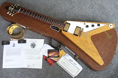 Joe Bonamassa is one of the best guitarists in the world and also one of the nicest, most humble guys around and we are honored to be selling his tour-used '82 Gibson Heritage Flying V in this 7-day NO RESERVE auction starting at just 99 cents!Joe's popularity and importance in the blues/rock world has been increasing exponenti ally and this is your chance to own a guitar he has been using during the height of his career...a 1982 Gibson Heritage Korina Flying V. Previously owned and used by British rocker Adam Ant for 10 years. Complete with signed letters of authenticity (below) from each celebrity and a load of extras, including Joe's stage-used gold strap, two boxes of Joe Bonamassa picks (old style and new style), his stage-used gold strap, the original hang tags, Gibson receipt dated 1984, the original case handle (current one is a leather replacement).As his letter says, Joe used this V during three tours with two bands -- his solo group and Black Country Communion. It was used on many different songs (and almost always the closing number with the solo band) and there are all sorts of photos and videos of Joe using this guitar in 2011 and 2012, just a few of which are below. Everything will be expertly packed in a double-walled guitar box. Shipping is $90 Fedex to the lower 48 states (fully insured, and internationally we ship USPS Express (or USPS Priority International depending on country restrictions) for $190 (with maximum insurance available). Canada, Alaska and Hawaii will be a $140 flat rate. Local pickup is great but California buyers are subject to sales tax. Payment is required within 48 hours of buy-it-now. We guarantee this item's authenticity and stand by our description 100%, but we cannot accept returns for subjective reasons, even at the buyer's expense (this item is consigned).International bidders -- There are no returns for International purchases. Before bidding, please make sure the USPS size restrictions to your country have the 108 inches length plus girth maximum size limit -- we have blocked bidders from most countries we can't ship to but there are exceptions for additional fees -- for example we CAN ship to Australia but shipping costs will be $600+. We will ignore any questions regarding size restrictions for your country...you can easily find this info on the USPS site. Same goes for quotes...we charge the flat rate listed. If the actual international shipping price is less than $180, we will refund the difference.You can trust our 13-year selling history on eBay, our unanimous 5/5 seller ratings, and our dedicated passion for great vintage guitars. See our feedback, we are very proud! We are happy to provide additional pictures and you can bet we'll answer all questions in a timely manner. Bid with confidence. HAPPY BIDDING AND GOOD LUCK! ... Click for more info