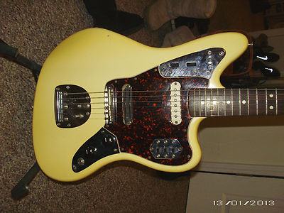 Here is a nice Fender Jaguar guitar for auction. This guitar plays and sounds amazing. Everything works as is should. The frets are good as well, very little-if any-wear. This finish has a few dings and scratches-I tried to show you the worst one in the photos. Now for the tricky part. I really have now idea how to date or identify these guitars. I do not know if this one is vintage or modern, USA or Mexico, and don't really know how to tell. I'm not even sure if they made these in Mexico or not. A guitar shop told me to remove the neck and it would have a date and other information stamped on it, but I'll leave that to the pros. I can say that it plays and sounds really good. It comes with a gig bag. As with every auction I do, this one has NO RESERVE. Any questions feel free to ask. Thanks. ... Click for more info